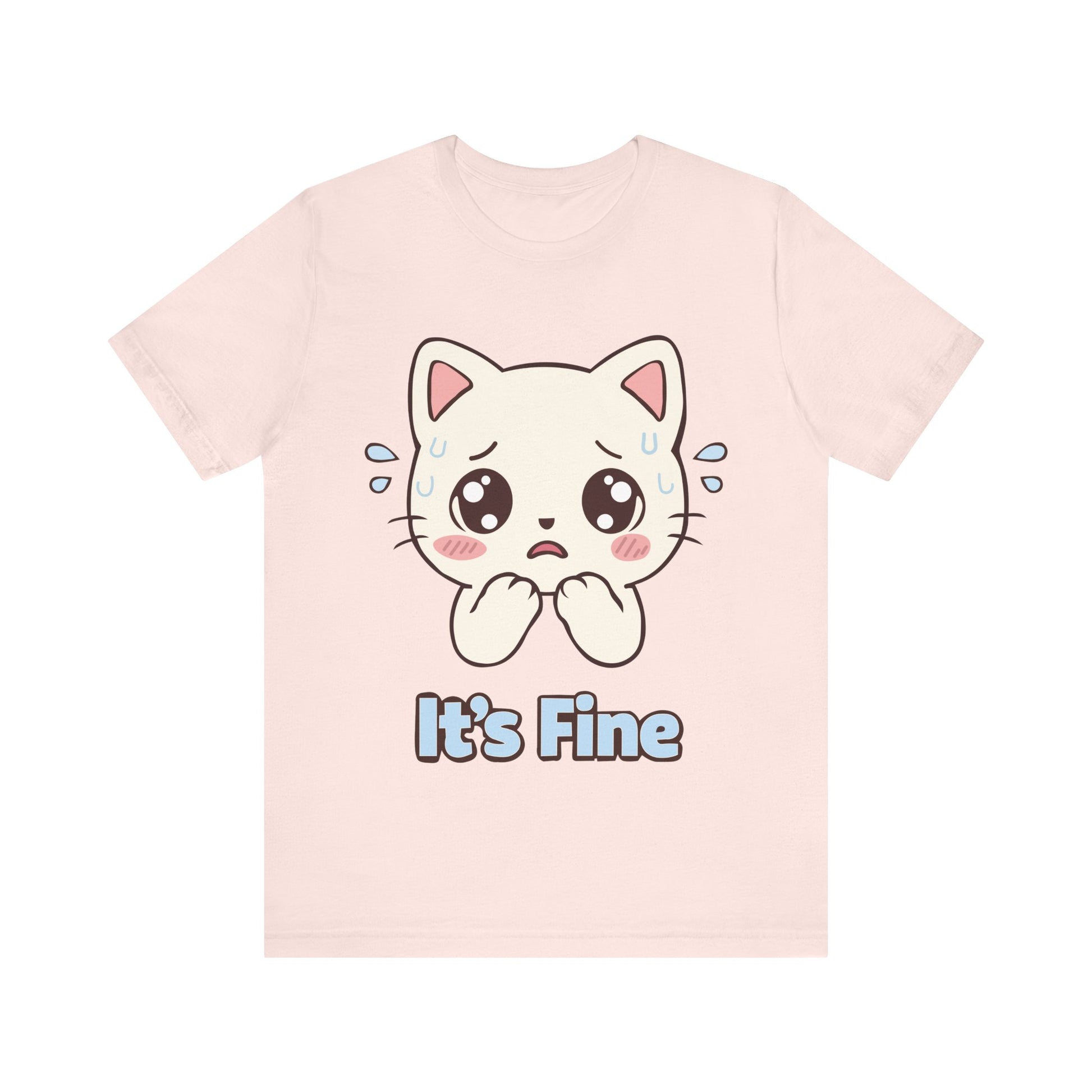 Soft, breathable, and quietly expressive — this jersey tee features an adorable kawaii cat with wide, worried eyes and the gentle, ironic caption “It’s Fine.” The lightweight Airlume combed cotton feels cool against skin and drapes casually for everyday wear. Subtle ribbed collar and side seams keep the shape neat after many washes, while shoulder tape adds structure for a clean silhouette. The design’s pastel tones and sweet illustration read like a small, relatable confession — the kind of tee you reach for when you want comfort and a wink at life’s tiny anxieties. Wear it layered under a cardigan for relaxed coffee runs, or solo with jeans on days you need quiet reassurance.