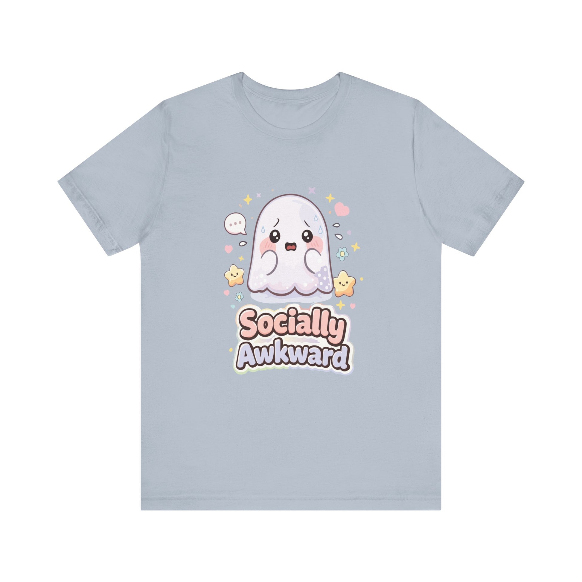 Soft, light, and quietly expressive — this jersey tee carries a tiny, blushing ghost and the words “Socially Awkward” in pastel tones. The illustration feels like a whispered confession: shy, sincere, and a little sweet. Wear it when you want clothing that reflects small, honest moments — running errands, low-key hangouts, or cozy nights in. It layers easily under a cardigan or stands alone with jeans, sending a gentle, relatable message without shouting. The breathable cotton and neat crew neckline keep the focus on comfort and the design’s soft, kawaii charm.